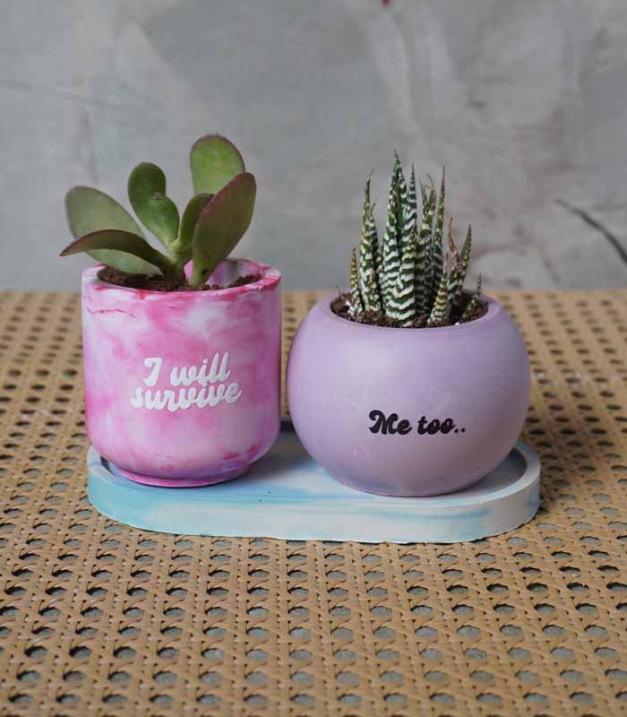 two adorable succulents in playful quote pots that say “I Will Survive” and “Me Too”. Styled together on a sleek oval tray, this set is made to brighten desks, shelves, and tiny corners with personality.
