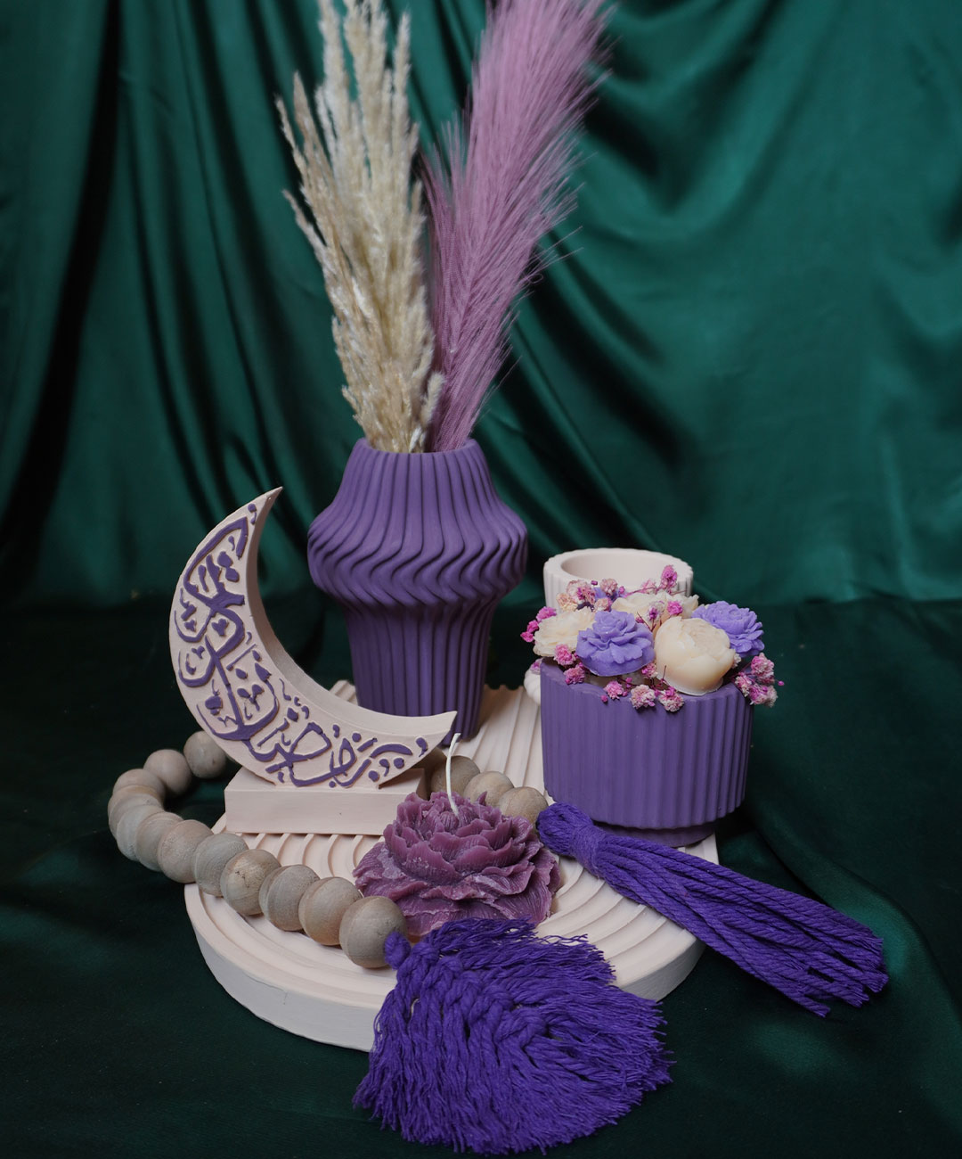 A statement big arch tray styled with a sleek Nordic vase, a striped ornament jar, a small striped flower bouquet, Ramadan décor accents, peony candle and a natural wood bead garland. This thoughtfully curated set brings elegance, warmth, and festive charm to your home—perfect for Ramadan styling, shelves, consoles, or gifting.